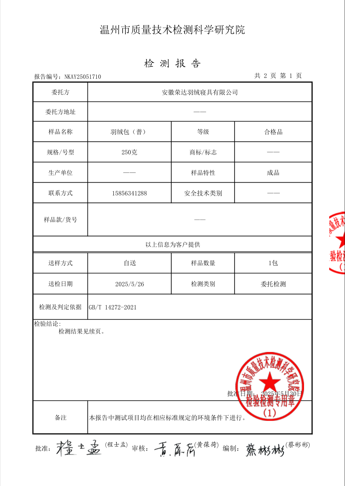 执行标准Test Standrad :GB/T 14272-2021