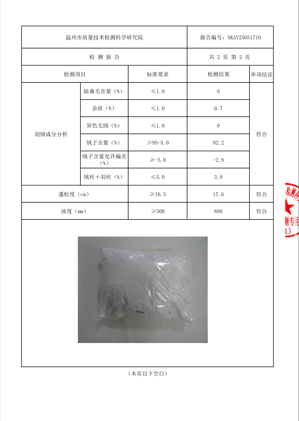 蓬松度Filling Power : 17.6cm