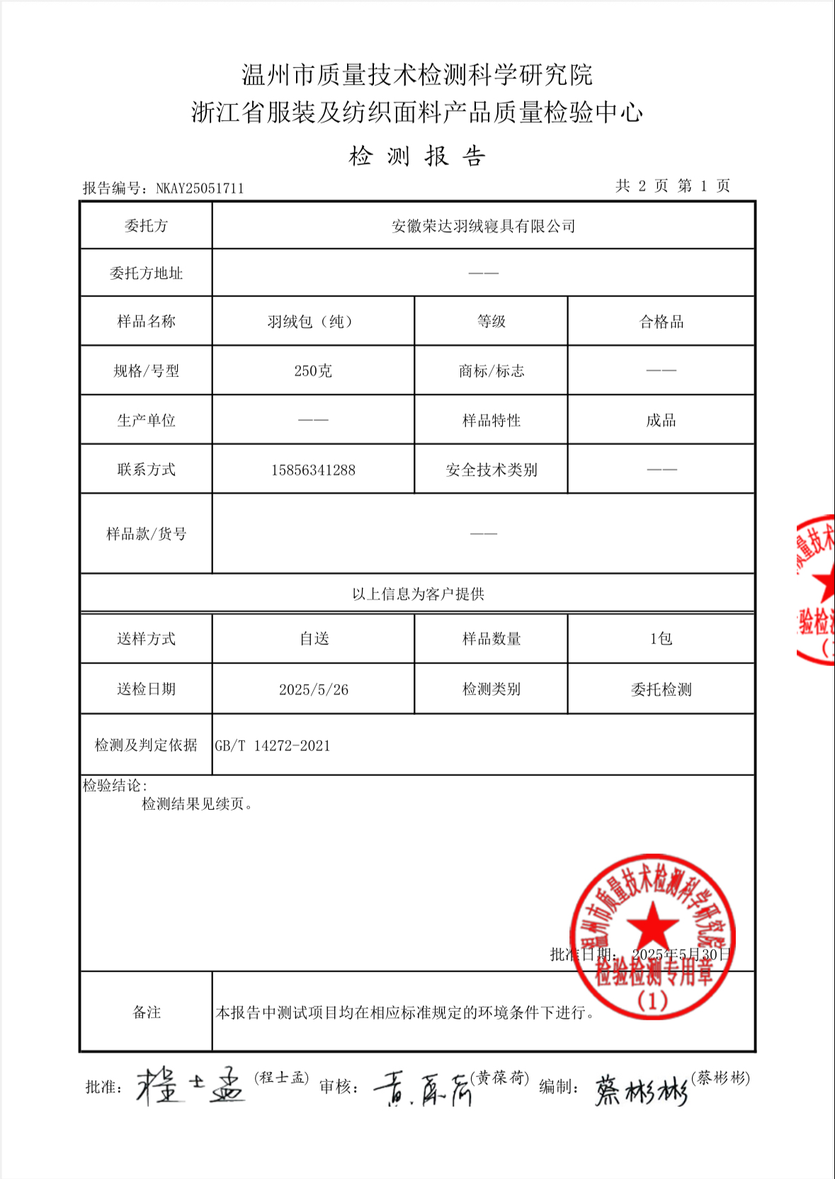 执行标准Test Standrad :GB/T 14272-2021